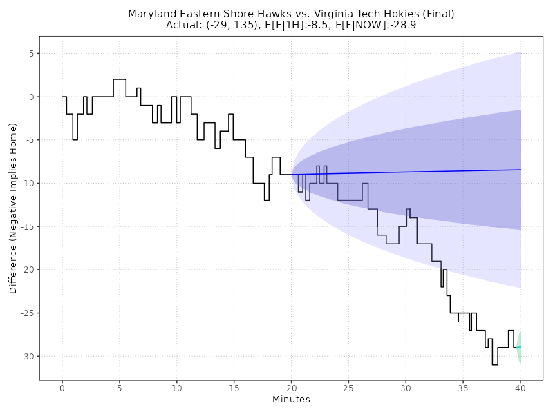 Updated: Monday, Dec 15 01:21:13 AM EST Maryland Eastern Shore Hawks vs Virginia Tech Hokies (Final) 53 - 82, (Margin: -29, Total: 135) Cassell Coliseum Second-Half conditional estimates based on a margin of -9.0 points and 67.0 total points (models are continuously adjusted up to Halftime) ------------------------------------------------------------------------------------------------------------------------------------------------------ E[AWAY] E[HOME] E[SP] 68% CI E[TOTAL] 68% CI 2H-A 2H-H 2H-SP 2H-TTL AWAY WIN% HOME WIN% (ODDS HOME) ====================================================================================================================================================== 67.3 75.0 -7.7 (-17.8, +2.3) 142.3 (130.2, 154.5) 0.0 0.0 -7.7 142.3 26.5% 73.5% -277 ------------------------------------------------------------------------------------------------------------------------------------------------------ Live conditional estimates per 5 Minutes (+/- 1 deviation) (models are continuously adjusted) ------------------------------------------------------------------------------------------------------------------------------------------------------ TYPE 5M 10M 15M 20M 25M 30M 35M 40M ====================================================================================================================================================== E[SP] - - - - - - - -29.4 P[W] - - - - - - - 100.0% ODDS - - - - - - - - ------------------------------------------------------------------------------------------------------------------------------------------------------ Ornstein-Uhlenbeck Process with BIC Model Selection** TYPE L95% E[X] U95% E[F|1H] -22.1 -8.5 5.2 E[F|NOW] -32.7 -28.9 -25.1 Deep Learning: Quantile GRU v6.0 (Neural Network with Calibrated Uncertainty) TYPE L95% L68% E[X] U68% U95% E[F|1H] -11.3 -9.8 -9.3 -8.7 -7.7 E[F|NOW] -34.2 -30.1 -28.6 -26.8 -24.0 Enhanced Ornstein-Uhlenbeck Process (BIC-optimized AR order, continuous-time Kalman filtering)MODEL NOTES: ** O-U Process validated on 61,166 games (MAE: 8.50 pts, well-calibrated 68%/95% confidence intervals) ** GRU v6.0 validated on Fall 2025 (MAE: 10.99 pts, 5.2% better than previous LSTM) CHART LEGEND: 1) Blue line: O-U Improved model trained on first-half data, locked at halftime (68% and 95% CI shown) 2) Green line: O-U Improved model continuously retrained as new plays arrive (68% CI shown) 3) Both lines use the same statistical model; divergence shows how live events update predictions 4) Model automatically selects AR(1) or AR(2) using BIC for optimal fit to irregular scoring events Updated: Monday, Dec 15 01:21:13 AM EST Back
