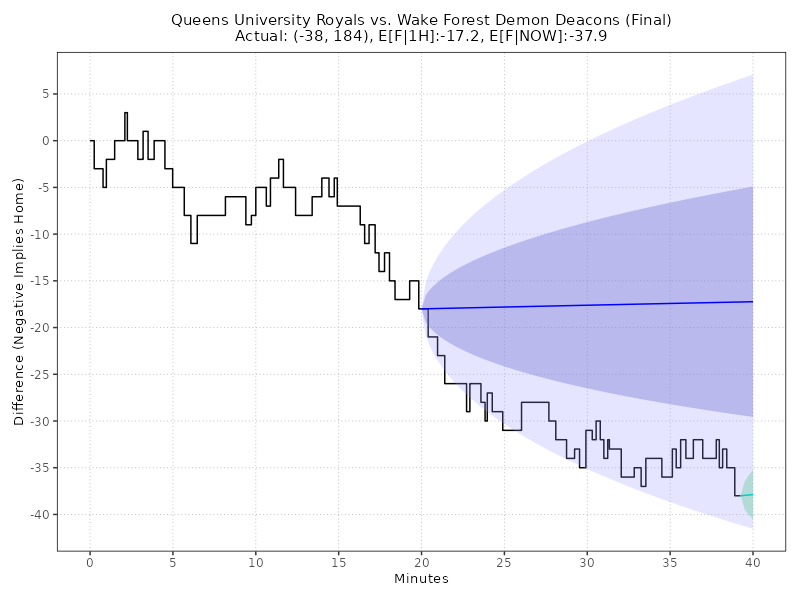 Updated: Monday, Dec 15 01:23:30 AM EST Queens University Royals vs Wake Forest Demon Deacons (Final) 73 - 111, (Margin: -38, Total: 184) LJVM Coliseum Second-Half conditional estimates based on a margin of -18.0 points and 96.0 total points (models are continuously adjusted up to Halftime) ------------------------------------------------------------------------------------------------------------------------------------------------------ E[AWAY] E[HOME] E[SP] 68% CI E[TOTAL] 68% CI 2H-A 2H-H 2H-SP 2H-TTL AWAY WIN% HOME WIN% (ODDS HOME) ====================================================================================================================================================== 91.8 110.0 -18.1 (-28.2, -8.1) 201.8 (189.6, 214.0) 0.0 0.0 -18.1 201.8 6.6% 93.4% -1414 ------------------------------------------------------------------------------------------------------------------------------------------------------ Live conditional estimates per 5 Minutes (+/- 1 deviation) (models are continuously adjusted) ------------------------------------------------------------------------------------------------------------------------------------------------------ TYPE 5M 10M 15M 20M 25M 30M 35M 40M ====================================================================================================================================================== E[SP] - - - - - - - -38.3 P[W] - - - - - - - 100.0% ODDS - - - - - - - - ------------------------------------------------------------------------------------------------------------------------------------------------------ Ornstein-Uhlenbeck Process with BIC Model Selection** TYPE L95% E[X] U95% E[F|1H] -41.5 -17.2 7.1 E[F|NOW] -43.0 -37.9 -32.7 Deep Learning: Quantile GRU v6.0 (Neural Network with Calibrated Uncertainty) TYPE L95% L68% E[X] U68% U95% E[F|1H] -21.8 -19.1 -18.1 -17.0 -15.2 E[F|NOW] -44.8 -39.4 -37.4 -35.1 -31.5 Enhanced Ornstein-Uhlenbeck Process (BIC-optimized AR order, continuous-time Kalman filtering)MODEL NOTES: ** O-U Process validated on 61,166 games (MAE: 8.50 pts, well-calibrated 68%/95% confidence intervals) ** GRU v6.0 validated on Fall 2025 (MAE: 10.99 pts, 5.2% better than previous LSTM) CHART LEGEND: 1) Blue line: O-U Improved model trained on first-half data, locked at halftime (68% and 95% CI shown) 2) Green line: O-U Improved model continuously retrained as new plays arrive (68% CI shown) 3) Both lines use the same statistical model; divergence shows how live events update predictions 4) Model automatically selects AR(1) or AR(2) using BIC for optimal fit to irregular scoring events Updated: Monday, Dec 15 01:23:30 AM EST Back