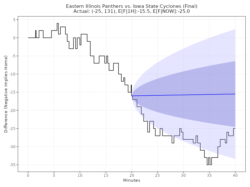 Updated: Monday, Dec 15 01:21:07 AM EST Eastern Illinois Panthers vs Iowa State Cyclones (Final) 53 - 78, (Margin: -25, Total: 131) Hilton Coliseum Second-Half conditional estimates based on a margin of -16.0 points and 72.0 total points (models are continuously adjusted up to Halftime) ------------------------------------------------------------------------------------------------------------------------------------------------------ E[AWAY] E[HOME] E[SP] 68% CI E[TOTAL] 68% CI 2H-A 2H-H 2H-SP 2H-TTL AWAY WIN% HOME WIN% (ODDS HOME) ====================================================================================================================================================== 68.4 84.2 -15.8 (-25.9, -5.8) 152.6 (140.4, 164.8) 0.0 0.0 -15.8 152.6 9.2% 90.8% -985 ------------------------------------------------------------------------------------------------------------------------------------------------------ Live conditional estimates per 5 Minutes (+/- 1 deviation) (models are continuously adjusted) ------------------------------------------------------------------------------------------------------------------------------------------------------ TYPE 5M 10M 15M 20M 25M 30M 35M 40M ====================================================================================================================================================== E[SP] - - - - - - - -25.4 P[W] - - - - - - - 100.0% ODDS - - - - - - - - ------------------------------------------------------------------------------------------------------------------------------------------------------ Ornstein-Uhlenbeck Process with BIC Model Selection** TYPE L95% E[X] U95% E[F|1H] -33.4 -15.5 2.4 E[F|NOW] -25.0 -25.0 -25.0 Deep Learning: Quantile GRU v6.0 (Neural Network with Calibrated Uncertainty) TYPE L95% L68% E[X] U68% U95% E[F|1H] -19.5 -17.1 -16.2 -15.1 -13.5 E[F|NOW] -29.5 -25.9 -24.6 -23.1 -20.7 Enhanced Ornstein-Uhlenbeck Process (BIC-optimized AR order, continuous-time Kalman filtering)MODEL NOTES: ** O-U Process validated on 61,166 games (MAE: 8.50 pts, well-calibrated 68%/95% confidence intervals) ** GRU v6.0 validated on Fall 2025 (MAE: 10.99 pts, 5.2% better than previous LSTM) CHART LEGEND: 1) Blue line: O-U Improved model trained on first-half data, locked at halftime (68% and 95% CI shown) 2) Green line: O-U Improved model continuously retrained as new plays arrive (68% CI shown) 3) Both lines use the same statistical model; divergence shows how live events update predictions 4) Model automatically selects AR(1) or AR(2) using BIC for optimal fit to irregular scoring events Updated: Monday, Dec 15 01:21:07 AM EST Back