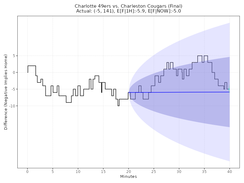 Updated: Monday, Dec 15 01:23:12 AM EST Charlotte 49ers vs Charleston Cougars (Final) 67 - 74, (Margin: -7, Total: 141) TD Arena Second-Half conditional estimates based on a margin of -6.0 points and 72.0 total points (models are continuously adjusted up to Halftime) ------------------------------------------------------------------------------------------------------------------------------------------------------ E[AWAY] E[HOME] E[SP] 68% CI E[TOTAL] 68% CI 2H-A 2H-H 2H-SP 2H-TTL AWAY WIN% HOME WIN% (ODDS HOME) ====================================================================================================================================================== 74.2 78.4 -4.3 (-14.3, +5.8) 152.6 (140.4, 164.8) 0.0 0.0 -4.3 152.6 38.3% 61.7% -161 ------------------------------------------------------------------------------------------------------------------------------------------------------ Live conditional estimates per 5 Minutes (+/- 1 deviation) (models are continuously adjusted) ------------------------------------------------------------------------------------------------------------------------------------------------------ TYPE 5M 10M 15M 20M 25M 30M 35M 40M ====================================================================================================================================================== E[SP] - - - - - - - -5.5 P[W] - - - - - - - 100.0% ODDS - - - - - - - -99999 ------------------------------------------------------------------------------------------------------------------------------------------------------ Ornstein-Uhlenbeck Process with BIC Model Selection** TYPE L95% E[X] U95% E[F|1H] -26.6 -5.9 14.9 E[F|NOW] -8.1 -5.0 -1.9 Deep Learning: Quantile GRU v6.0 (Neural Network with Calibrated Uncertainty) TYPE L95% L68% E[X] U68% U95% E[F|1H] -7.6 -6.6 -6.2 -5.8 -5.0 E[F|NOW] -6.1 -5.3 -5.0 -4.6 -4.0 Enhanced Ornstein-Uhlenbeck Process (BIC-optimized AR order, continuous-time Kalman filtering)MODEL NOTES: ** O-U Process validated on 61,166 games (MAE: 8.50 pts, well-calibrated 68%/95% confidence intervals) ** GRU v6.0 validated on Fall 2025 (MAE: 10.99 pts, 5.2% better than previous LSTM) CHART LEGEND: 1) Blue line: O-U Improved model trained on first-half data, locked at halftime (68% and 95% CI shown) 2) Green line: O-U Improved model continuously retrained as new plays arrive (68% CI shown) 3) Both lines use the same statistical model; divergence shows how live events update predictions 4) Model automatically selects AR(1) or AR(2) using BIC for optimal fit to irregular scoring events Updated: Monday, Dec 15 01:23:12 AM EST Back