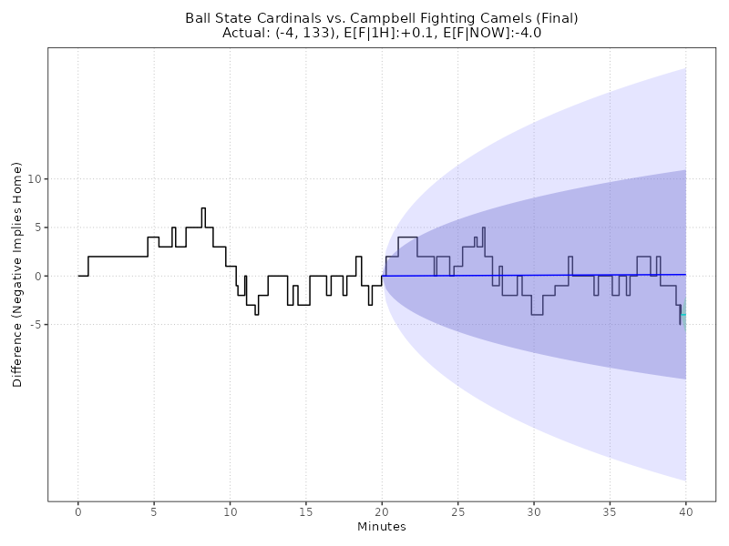 Updated: Monday, Dec 15 01:22:23 AM EST Ball State Cardinals vs Campbell Fighting Camels (Final) 64 - 69, (Margin: -5, Total: 133) John W. Pope Jr. Convocation Center Second-Half conditional estimates based on a margin of +0.0 points and 60.0 total points (models are continuously adjusted up to Halftime) ------------------------------------------------------------------------------------------------------------------------------------------------------ E[AWAY] E[HOME] E[SP] 68% CI E[TOTAL] 68% CI 2H-A 2H-H 2H-SP 2H-TTL AWAY WIN% HOME WIN% (ODDS HOME) ====================================================================================================================================================== 65.3 62.7 2.7 (-7.4, +12.7) 128.0 (115.8, 140.2) 0.0 0.0 +2.7 128.0 64.8% 35.2% +184 ------------------------------------------------------------------------------------------------------------------------------------------------------ Live conditional estimates per 5 Minutes (+/- 1 deviation) (models are continuously adjusted) ------------------------------------------------------------------------------------------------------------------------------------------------------ TYPE 5M 10M 15M 20M 25M 30M 35M 40M ====================================================================================================================================================== E[SP] - - - - - - - -4.5 P[W] - - - - - - - 100.0% ODDS - - - - - - - -99999 ------------------------------------------------------------------------------------------------------------------------------------------------------ Ornstein-Uhlenbeck Process with BIC Model Selection** TYPE L95% E[X] U95% E[F|1H] -21.1 0.1 21.4 E[F|NOW] -7.7 -4.0 -0.3 Deep Learning: Quantile GRU v6.0 (Neural Network with Calibrated Uncertainty) TYPE L95% L68% E[X] U68% U95% E[F|1H] -0.9 -0.6 -0.5 -0.3 0.0 E[F|NOW] -5.0 -4.3 -4.0 -3.7 -3.2 Enhanced Ornstein-Uhlenbeck Process (BIC-optimized AR order, continuous-time Kalman filtering)MODEL NOTES: ** O-U Process validated on 61,166 games (MAE: 8.50 pts, well-calibrated 68%/95% confidence intervals) ** GRU v6.0 validated on Fall 2025 (MAE: 10.99 pts, 5.2% better than previous LSTM) CHART LEGEND: 1) Blue line: O-U Improved model trained on first-half data, locked at halftime (68% and 95% CI shown) 2) Green line: O-U Improved model continuously retrained as new plays arrive (68% CI shown) 3) Both lines use the same statistical model; divergence shows how live events update predictions 4) Model automatically selects AR(1) or AR(2) using BIC for optimal fit to irregular scoring events Updated: Monday, Dec 15 01:22:23 AM EST Back