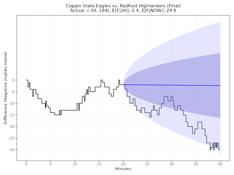 Updated: Monday, Dec 15 01:22:35 AM EST Coppin State Eagles vs Radford Highlanders (Final) 77 - 107, (Margin: -30, Total: 184) The Dedmon Center Second-Half conditional estimates based on a margin of -2.0 points and 84.0 total points (models are continuously adjusted up to Halftime) ------------------------------------------------------------------------------------------------------------------------------------------------------ E[AWAY] E[HOME] E[SP] 68% CI E[TOTAL] 68% CI 2H-A 2H-H 2H-SP 2H-TTL AWAY WIN% HOME WIN% (ODDS HOME) ====================================================================================================================================================== 88.8 88.4 0.3 (-9.7, +10.4) 177.2 (165.0, 189.4) 0.0 0.0 +0.3 177.2 56.2% 43.8% +128 ------------------------------------------------------------------------------------------------------------------------------------------------------ Live conditional estimates per 5 Minutes (+/- 1 deviation) (models are continuously adjusted) ------------------------------------------------------------------------------------------------------------------------------------------------------ TYPE 5M 10M 15M 20M 25M 30M 35M 40M ====================================================================================================================================================== E[SP] - - - - - - - -30.4 P[W] - - - - - - - 100.0% ODDS - - - - - - - - ------------------------------------------------------------------------------------------------------------------------------------------------------ Ornstein-Uhlenbeck Process with BIC Model Selection** TYPE L95% E[X] U95% E[F|1H] -29.8 -2.4 25.0 E[F|NOW] -33.8 -29.9 -26.1 Deep Learning: Quantile GRU v6.0 (Neural Network with Calibrated Uncertainty) TYPE L95% L68% E[X] U68% U95% E[F|1H] -2.7 -2.3 -2.1 -1.9 -1.5 E[F|NOW] -35.5 -31.2 -29.6 -27.7 -24.9 Enhanced Ornstein-Uhlenbeck Process (BIC-optimized AR order, continuous-time Kalman filtering)MODEL NOTES: ** O-U Process validated on 61,166 games (MAE: 8.50 pts, well-calibrated 68%/95% confidence intervals) ** GRU v6.0 validated on Fall 2025 (MAE: 10.99 pts, 5.2% better than previous LSTM) CHART LEGEND: 1) Blue line: O-U Improved model trained on first-half data, locked at halftime (68% and 95% CI shown) 2) Green line: O-U Improved model continuously retrained as new plays arrive (68% CI shown) 3) Both lines use the same statistical model; divergence shows how live events update predictions 4) Model automatically selects AR(1) or AR(2) using BIC for optimal fit to irregular scoring events Updated: Monday, Dec 15 01:22:35 AM EST Back
