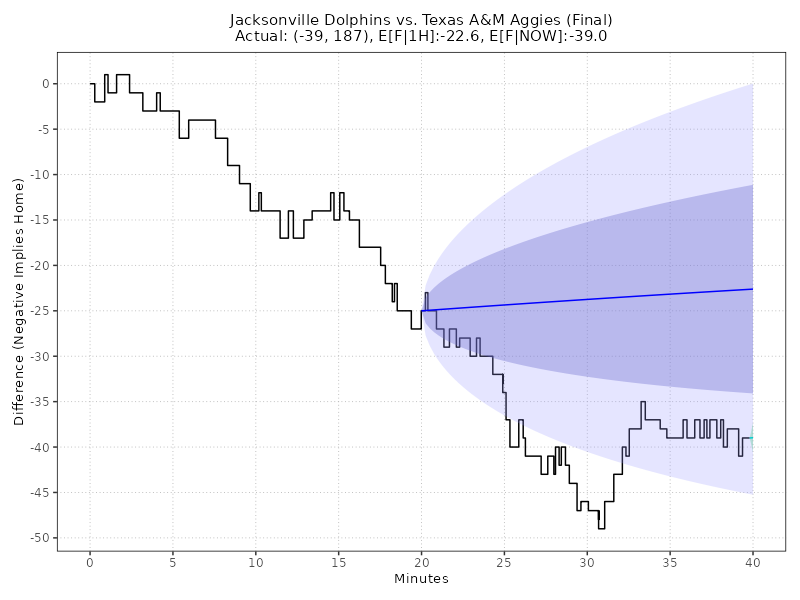 Updated: Monday, Dec 15 01:24:07 AM EST Jacksonville Dolphins vs Texas A&M Aggies (Final) 75 - 112, (Margin: -37, Total: 187) Reed Arena Second-Half conditional estimates based on a margin of -25.0 points and 77.0 total points (models are continuously adjusted up to Halftime) ------------------------------------------------------------------------------------------------------------------------------------------------------ E[AWAY] E[HOME] E[SP] 68% CI E[TOTAL] 68% CI 2H-A 2H-H 2H-SP 2H-TTL AWAY WIN% HOME WIN% (ODDS HOME) ====================================================================================================================================================== 68.3 94.5 -26.2 (-36.3, -16.2) 162.8 (150.7, 175.0) 0.0 0.0 -26.2 162.8 2.0% 98.0% -5021 ------------------------------------------------------------------------------------------------------------------------------------------------------ Live conditional estimates per 5 Minutes (+/- 1 deviation) (models are continuously adjusted) ------------------------------------------------------------------------------------------------------------------------------------------------------ TYPE 5M 10M 15M 20M 25M 30M 35M 40M ====================================================================================================================================================== E[SP] - - - - - - - -39.3 P[W] - - - - - - - 100.0% ODDS - - - - - - - - ------------------------------------------------------------------------------------------------------------------------------------------------------ Ornstein-Uhlenbeck Process with BIC Model Selection** TYPE L95% E[X] U95% E[F|1H] -45.2 -22.6 0.0 E[F|NOW] -42.1 -39.0 -35.8 Deep Learning: Quantile GRU v6.0 (Neural Network with Calibrated Uncertainty) TYPE L95% L68% E[X] U68% U95% E[F|1H] -30.0 -26.3 -25.0 -23.4 -21.0 E[F|NOW] -45.9 -40.3 -38.4 -35.9 -32.3 Enhanced Ornstein-Uhlenbeck Process (BIC-optimized AR order, continuous-time Kalman filtering)MODEL NOTES: ** O-U Process validated on 61,166 games (MAE: 8.50 pts, well-calibrated 68%/95% confidence intervals) ** GRU v6.0 validated on Fall 2025 (MAE: 10.99 pts, 5.2% better than previous LSTM) CHART LEGEND: 1) Blue line: O-U Improved model trained on first-half data, locked at halftime (68% and 95% CI shown) 2) Green line: O-U Improved model continuously retrained as new plays arrive (68% CI shown) 3) Both lines use the same statistical model; divergence shows how live events update predictions 4) Model automatically selects AR(1) or AR(2) using BIC for optimal fit to irregular scoring events Updated: Monday, Dec 15 01:24:07 AM EST Back