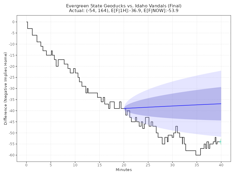 Updated: Monday, Dec 15 01:23:18 AM EST Evergreen State Geoducks vs Idaho Vandals (Final) 55 - 109, (Margin: -54, Total: 164) ICCU Arena Second-Half conditional estimates based on a margin of -39.0 points and 73.0 total points (models are continuously adjusted up to Halftime) ------------------------------------------------------------------------------------------------------------------------------------------------------ E[AWAY] E[HOME] E[SP] 68% CI E[TOTAL] 68% CI 2H-A 2H-H 2H-SP 2H-TTL AWAY WIN% HOME WIN% (ODDS HOME) ====================================================================================================================================================== 56.1 98.5 -42.4 (-52.5, -32.4) 154.6 (142.4, 166.8) 0.0 0.0 -42.4 154.6 0.2% 99.8% -63316 ------------------------------------------------------------------------------------------------------------------------------------------------------ Live conditional estimates per 5 Minutes (+/- 1 deviation) (models are continuously adjusted) ------------------------------------------------------------------------------------------------------------------------------------------------------ TYPE 5M 10M 15M 20M 25M 30M 35M 40M ====================================================================================================================================================== E[SP] - - - - - - - -54.2 P[W] - - - - - - - 100.0% ODDS - - - - - - - - ------------------------------------------------------------------------------------------------------------------------------------------------------ Ornstein-Uhlenbeck Process with BIC Model Selection** TYPE L95% E[X] U95% E[F|1H] -51.7 -36.9 -22.0 E[F|NOW] -57.0 -53.9 -50.9 Deep Learning: Quantile GRU v6.0 (Neural Network with Calibrated Uncertainty) TYPE L95% L68% E[X] U68% U95% E[F|1H] -46.3 -40.7 -38.7 -36.3 -32.6 E[F|NOW] -63.4 -55.8 -53.1 -49.7 -44.8 Enhanced Ornstein-Uhlenbeck Process (BIC-optimized AR order, continuous-time Kalman filtering)MODEL NOTES: ** O-U Process validated on 61,166 games (MAE: 8.50 pts, well-calibrated 68%/95% confidence intervals) ** GRU v6.0 validated on Fall 2025 (MAE: 10.99 pts, 5.2% better than previous LSTM) CHART LEGEND: 1) Blue line: O-U Improved model trained on first-half data, locked at halftime (68% and 95% CI shown) 2) Green line: O-U Improved model continuously retrained as new plays arrive (68% CI shown) 3) Both lines use the same statistical model; divergence shows how live events update predictions 4) Model automatically selects AR(1) or AR(2) using BIC for optimal fit to irregular scoring events Updated: Monday, Dec 15 01:23:18 AM EST Back