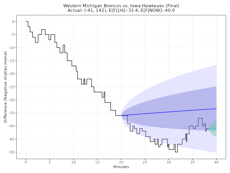 Updated: Monday, Dec 15 01:23:01 AM EST Western Michigan Broncos vs Iowa Hawkeyes (Final) 51 - 91, (Margin: -40, Total: 142) Carver-Hawkeye Arena Second-Half conditional estimates based on a margin of -36.0 points and 68.0 total points (models are continuously adjusted up to Halftime) ------------------------------------------------------------------------------------------------------------------------------------------------------ E[AWAY] E[HOME] E[SP] 68% CI E[TOTAL] 68% CI 2H-A 2H-H 2H-SP 2H-TTL AWAY WIN% HOME WIN% (ODDS HOME) ====================================================================================================================================================== 52.7 91.7 -38.9 (-49.0, -28.9) 144.4 (132.2, 156.6) 0.0 0.0 -38.9 144.4 0.3% 99.7% -36784 ------------------------------------------------------------------------------------------------------------------------------------------------------ Live conditional estimates per 5 Minutes (+/- 1 deviation) (models are continuously adjusted) ------------------------------------------------------------------------------------------------------------------------------------------------------ TYPE 5M 10M 15M 20M 25M 30M 35M 40M ====================================================================================================================================================== E[SP] - - - - - - - -41.3 P[W] - - - - - - - 100.0% ODDS - - - - - - - - ------------------------------------------------------------------------------------------------------------------------------------------------------ Ornstein-Uhlenbeck Process with BIC Model Selection** TYPE L95% E[X] U95% E[F|1H] -50.1 -33.4 -16.6 E[F|NOW] -47.6 -40.9 -34.1 Deep Learning: Quantile GRU v6.0 (Neural Network with Calibrated Uncertainty) TYPE L95% L68% E[X] U68% U95% E[F|1H] -42.8 -37.6 -35.8 -33.5 -30.1 E[F|NOW] -48.2 -42.4 -40.3 -37.8 -34.0 Enhanced Ornstein-Uhlenbeck Process (BIC-optimized AR order, continuous-time Kalman filtering)MODEL NOTES: ** O-U Process validated on 61,166 games (MAE: 8.50 pts, well-calibrated 68%/95% confidence intervals) ** GRU v6.0 validated on Fall 2025 (MAE: 10.99 pts, 5.2% better than previous LSTM) CHART LEGEND: 1) Blue line: O-U Improved model trained on first-half data, locked at halftime (68% and 95% CI shown) 2) Green line: O-U Improved model continuously retrained as new plays arrive (68% CI shown) 3) Both lines use the same statistical model; divergence shows how live events update predictions 4) Model automatically selects AR(1) or AR(2) using BIC for optimal fit to irregular scoring events Updated: Monday, Dec 15 01:23:01 AM EST Back