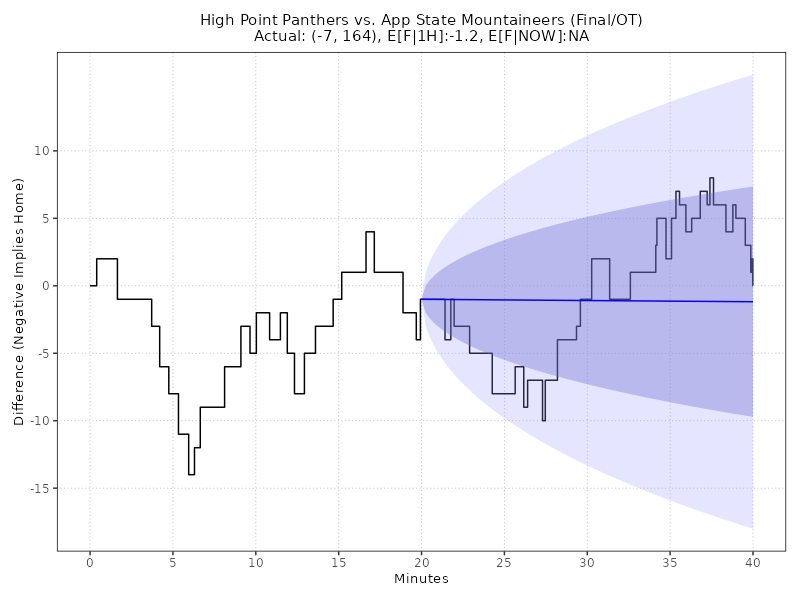 Updated: Monday, Dec 15 01:22:05 AM EST High Point Panthers vs App State Mountaineers (Final/OT) 78 - 86, (Margin: -8, Total: 164) Tarlton Complex Second-Half conditional estimates based on a margin of -1.0 points and 67.0 total points (models are continuously adjusted up to Halftime) ------------------------------------------------------------------------------------------------------------------------------------------------------ E[AWAY] E[HOME] E[SP] 68% CI E[TOTAL] 68% CI 2H-A 2H-H 2H-SP 2H-TTL AWAY WIN% HOME WIN% (ODDS HOME) ====================================================================================================================================================== 71.9 70.4 1.5 (-8.5, +11.5) 142.3 (130.2, 154.5) 0.0 0.0 +1.5 142.3 60.5% 39.5% +153 ------------------------------------------------------------------------------------------------------------------------------------------------------ Live conditional estimates per 5 Minutes (+/- 1 deviation) (models are continuously adjusted) ------------------------------------------------------------------------------------------------------------------------------------------------------ TYPE 5M 10M 15M 20M 25M 30M 35M 40M ====================================================================================================================================================== E[SP] - - - - - - - - P[W] - - - - - - - - ODDS - - - - - - - - ------------------------------------------------------------------------------------------------------------------------------------------------------ Deep Learning: Quantile GRU v6.0 (Neural Network with Calibrated Uncertainty) TYPE L95% L68% E[X] U68% U95% E[F|1H] -2.0 -1.6 -1.4 -1.2 -0.9 E[F|NOW] -9.1 -7.7 -7.1 -6.4 -5.2 Enhanced Ornstein-Uhlenbeck Process (BIC-optimized AR order, continuous-time Kalman filtering)MODEL NOTES: ** O-U Process validated on 61,166 games (MAE: 8.50 pts, well-calibrated 68%/95% confidence intervals) ** GRU v6.0 validated on Fall 2025 (MAE: 10.99 pts, 5.2% better than previous LSTM) CHART LEGEND: 1) Blue line: O-U Improved model trained on first-half data, locked at halftime (68% and 95% CI shown) 2) Green line: O-U Improved model continuously retrained as new plays arrive (68% CI shown) 3) Both lines use the same statistical model; divergence shows how live events update predictions 4) Model automatically selects AR(1) or AR(2) using BIC for optimal fit to irregular scoring events Updated: Monday, Dec 15 01:22:05 AM EST Back
