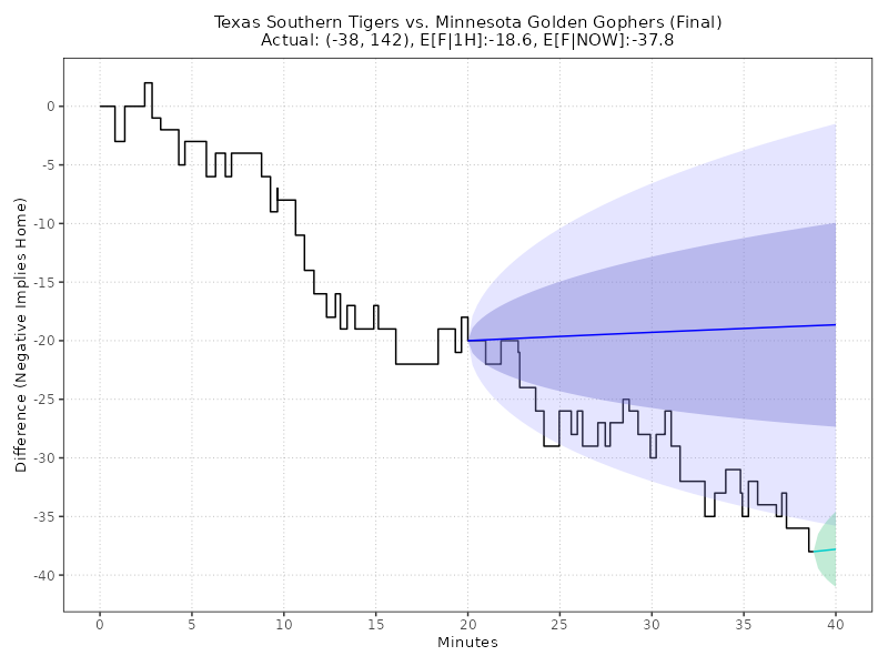 Updated: Monday, Dec 15 01:21:25 AM EST Texas Southern Tigers vs Minnesota Golden Gophers (Final) 53 - 89, (Margin: -36, Total: 142) Williams Arena Second-Half conditional estimates based on a margin of -20.0 points and 70.0 total points (models are continuously adjusted up to Halftime) ------------------------------------------------------------------------------------------------------------------------------------------------------ E[AWAY] E[HOME] E[SP] 68% CI E[TOTAL] 68% CI 2H-A 2H-H 2H-SP 2H-TTL AWAY WIN% HOME WIN% (ODDS HOME) ====================================================================================================================================================== 65.2 83.3 -18.1 (-28.2, -8.1) 148.5 (136.3, 160.7) 0.0 0.0 -18.1 148.5 6.6% 93.4% -1414 ------------------------------------------------------------------------------------------------------------------------------------------------------ Live conditional estimates per 5 Minutes (+/- 1 deviation) (models are continuously adjusted) ------------------------------------------------------------------------------------------------------------------------------------------------------ TYPE 5M 10M 15M 20M 25M 30M 35M 40M ====================================================================================================================================================== E[SP] - - - - - - - -38.3 P[W] - - - - - - - 100.0% ODDS - - - - - - - - ------------------------------------------------------------------------------------------------------------------------------------------------------ Ornstein-Uhlenbeck Process with BIC Model Selection** TYPE L95% E[X] U95% E[F|1H] -35.8 -18.6 -1.5 E[F|NOW] -44.1 -37.8 -31.5 Deep Learning: Quantile GRU v6.0 (Neural Network with Calibrated Uncertainty) TYPE L95% L68% E[X] U68% U95% E[F|1H] -24.2 -21.2 -20.1 -18.8 -16.8 E[F|NOW] -44.8 -39.4 -37.4 -35.1 -31.5 Enhanced Ornstein-Uhlenbeck Process (BIC-optimized AR order, continuous-time Kalman filtering)MODEL NOTES: ** O-U Process validated on 61,166 games (MAE: 8.50 pts, well-calibrated 68%/95% confidence intervals) ** GRU v6.0 validated on Fall 2025 (MAE: 10.99 pts, 5.2% better than previous LSTM) CHART LEGEND: 1) Blue line: O-U Improved model trained on first-half data, locked at halftime (68% and 95% CI shown) 2) Green line: O-U Improved model continuously retrained as new plays arrive (68% CI shown) 3) Both lines use the same statistical model; divergence shows how live events update predictions 4) Model automatically selects AR(1) or AR(2) using BIC for optimal fit to irregular scoring events Updated: Monday, Dec 15 01:21:25 AM EST Back