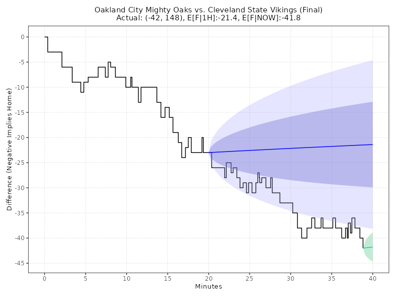 Updated: Monday, Dec 15 01:21:49 AM EST Oakland City Mighty Oaks vs Cleveland State Vikings (Final) 52 - 96, (Margin: -44, Total: 148) Wolstein Center Second-Half conditional estimates based on a margin of -23.0 points and 67.0 total points (models are continuously adjusted up to Halftime) ------------------------------------------------------------------------------------------------------------------------------------------------------ E[AWAY] E[HOME] E[SP] 68% CI E[TOTAL] 68% CI 2H-A 2H-H 2H-SP 2H-TTL AWAY WIN% HOME WIN% (ODDS HOME) ====================================================================================================================================================== 59.2 83.1 -23.9 (-34.0, -13.9) 142.3 (130.2, 154.5) 0.0 0.0 -23.9 142.3 2.8% 97.2% -3496 ------------------------------------------------------------------------------------------------------------------------------------------------------ Live conditional estimates per 5 Minutes (+/- 1 deviation) (models are continuously adjusted) ------------------------------------------------------------------------------------------------------------------------------------------------------ TYPE 5M 10M 15M 20M 25M 30M 35M 40M ====================================================================================================================================================== E[SP] - - - - - - - -42.3 P[W] - - - - - - - 100.0% ODDS - - - - - - - - ------------------------------------------------------------------------------------------------------------------------------------------------------ Ornstein-Uhlenbeck Process with BIC Model Selection** TYPE L95% E[X] U95% E[F|1H] -38.2 -21.4 -4.6 E[F|NOW] -47.5 -41.8 -36.0 Deep Learning: Quantile GRU v6.0 (Neural Network with Calibrated Uncertainty) TYPE L95% L68% E[X] U68% U95% E[F|1H] -27.6 -24.3 -23.0 -21.6 -19.3 E[F|NOW] -49.4 -43.5 -41.3 -38.7 -34.8 Enhanced Ornstein-Uhlenbeck Process (BIC-optimized AR order, continuous-time Kalman filtering)MODEL NOTES: ** O-U Process validated on 61,166 games (MAE: 8.50 pts, well-calibrated 68%/95% confidence intervals) ** GRU v6.0 validated on Fall 2025 (MAE: 10.99 pts, 5.2% better than previous LSTM) CHART LEGEND: 1) Blue line: O-U Improved model trained on first-half data, locked at halftime (68% and 95% CI shown) 2) Green line: O-U Improved model continuously retrained as new plays arrive (68% CI shown) 3) Both lines use the same statistical model; divergence shows how live events update predictions 4) Model automatically selects AR(1) or AR(2) using BIC for optimal fit to irregular scoring events Updated: Monday, Dec 15 01:21:49 AM EST Back
