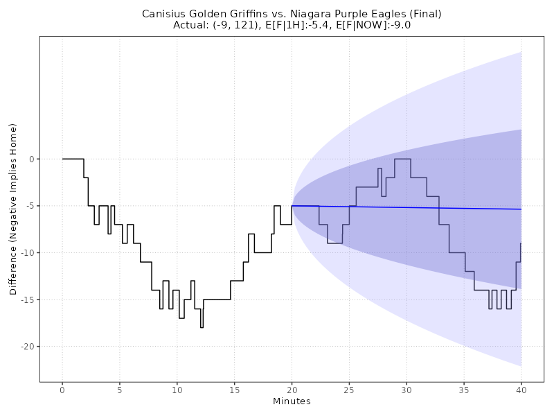 Updated: Tuesday, Feb 03 11:07:34 PM EST Canisius Golden Griffins vs Niagara Purple Eagles (Final) 56 - 65, (Margin: -9, Total: 121) Gallagher Center Second-Half conditional estimates based on a margin of -5.0 points and 71.0 total points (models are continuously adjusted up to Halftime) ------------------------------------------------------------------------------------------------------------------------------------------------------ E[AWAY] E[HOME] E[SP] 68% CI E[TOTAL] 68% CI 2H-A 2H-H 2H-SP 2H-TTL AWAY WIN% HOME WIN% (ODDS HOME) ====================================================================================================================================================== 73.7 76.8 -3.1 (-13.2, +6.9) 150.5 (138.3, 162.7) 0.0 0.0 -3.1 150.5 42.7% 57.3% -134 ------------------------------------------------------------------------------------------------------------------------------------------------------ Live conditional estimates per 5 Minutes (+/- 1 deviation) (models are continuously adjusted) ------------------------------------------------------------------------------------------------------------------------------------------------------ TYPE 5M 10M 15M 20M 25M 30M 35M 40M ====================================================================================================================================================== E[SP] - - - - - - - -9.5 P[W] - - - - - - - 100.0% ODDS - - - - - - - -99999 ------------------------------------------------------------------------------------------------------------------------------------------------------ Ornstein-Uhlenbeck Process with BIC Model Selection** TYPE L95% E[X] U95% E[F|1H] -22.2 -5.4 11.4 E[F|NOW] -9.0 -9.0 -9.0 Enhanced Ornstein-Uhlenbeck Process (BIC-optimized AR order, continuous-time Kalman filtering)MODEL NOTES: ** O-U Process validated on 61,166 games (MAE: 8.50 pts, well-calibrated 68%/95% confidence intervals) ** GRU v6.0 validated on Fall 2025 (MAE: 10.99 pts, 5.2% better than previous LSTM) CHART LEGEND: 1) Blue line: O-U Improved model trained on first-half data, locked at halftime (68% and 95% CI shown) 2) Green line: O-U Improved model continuously retrained as new plays arrive (68% CI shown) 3) Both lines use the same statistical model; divergence shows how live events update predictions 4) Model automatically selects AR(1) or AR(2) using BIC for optimal fit to irregular scoring events Updated: Tuesday, Feb 03 11:07:34 PM EST Back
