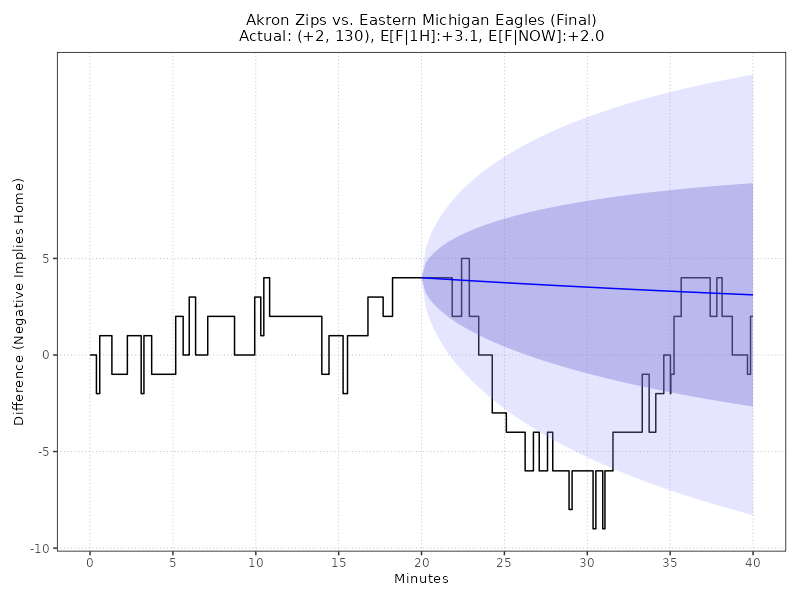 Updated: Tuesday, Feb 03 11:04:26 PM EST Akron Zips vs Eastern Michigan Eagles (Final) 66 - 64, (Margin: +2, Total: 130) Gervin GameAbove Center Second-Half conditional estimates based on a margin of +4.0 points and 58.0 total points (models are continuously adjusted up to Halftime) ------------------------------------------------------------------------------------------------------------------------------------------------------ E[AWAY] E[HOME] E[SP] 68% CI E[TOTAL] 68% CI 2H-A 2H-H 2H-SP 2H-TTL AWAY WIN% HOME WIN% (ODDS HOME) ====================================================================================================================================================== 65.6 58.3 7.3 (-2.8, +17.3) 123.9 (111.7, 136.1) 0.0 0.0 +7.3 123.9 79.1% 20.9% +379 ------------------------------------------------------------------------------------------------------------------------------------------------------ Live conditional estimates per 5 Minutes (+/- 1 deviation) (models are continuously adjusted) ------------------------------------------------------------------------------------------------------------------------------------------------------ TYPE 5M 10M 15M 20M 25M 30M 35M 40M ====================================================================================================================================================== E[SP] - - - - - - - +1.4 P[W] - - - - - - - 0.1% ODDS - - - - - - - +99999 ------------------------------------------------------------------------------------------------------------------------------------------------------ Ornstein-Uhlenbeck Process with BIC Model Selection** TYPE L95% E[X] U95% E[F|1H] -8.3 3.1 14.5 E[F|NOW] 2.0 2.0 2.0 Enhanced Ornstein-Uhlenbeck Process (BIC-optimized AR order, continuous-time Kalman filtering)MODEL NOTES: ** O-U Process validated on 61,166 games (MAE: 8.50 pts, well-calibrated 68%/95% confidence intervals) ** GRU v6.0 validated on Fall 2025 (MAE: 10.99 pts, 5.2% better than previous LSTM) CHART LEGEND: 1) Blue line: O-U Improved model trained on first-half data, locked at halftime (68% and 95% CI shown) 2) Green line: O-U Improved model continuously retrained as new plays arrive (68% CI shown) 3) Both lines use the same statistical model; divergence shows how live events update predictions 4) Model automatically selects AR(1) or AR(2) using BIC for optimal fit to irregular scoring events Updated: Tuesday, Feb 03 11:04:26 PM EST Back
