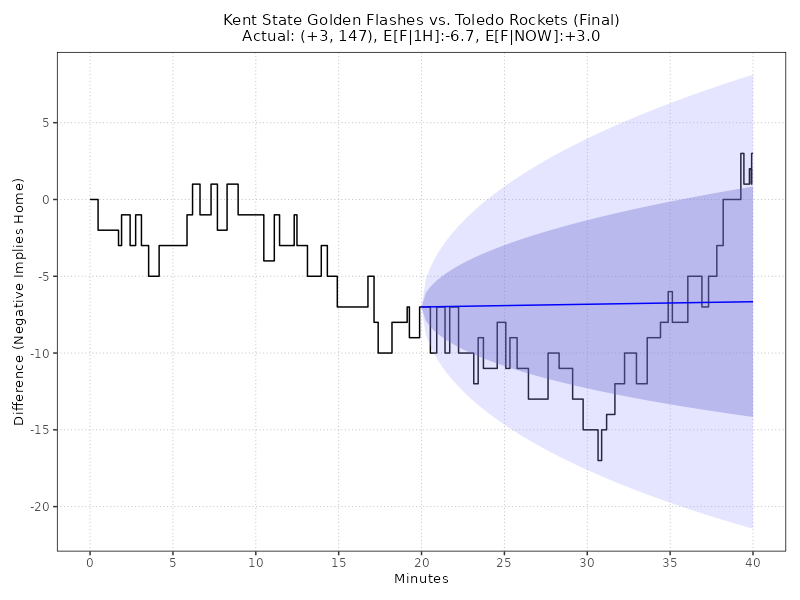 Updated: Tuesday, Feb 03 11:06:13 PM EST Kent State Golden Flashes vs Toledo Rockets (Final) 75 - 72, (Margin: +3, Total: 147) Savage Arena Second-Half conditional estimates based on a margin of -7.0 points and 65.0 total points (models are continuously adjusted up to Halftime) ------------------------------------------------------------------------------------------------------------------------------------------------------ E[AWAY] E[HOME] E[SP] 68% CI E[TOTAL] 68% CI 2H-A 2H-H 2H-SP 2H-TTL AWAY WIN% HOME WIN% (ODDS HOME) ====================================================================================================================================================== 66.4 71.8 -5.4 (-15.5, +4.6) 138.2 (126.0, 150.4) 0.0 0.0 -5.4 138.2 34.1% 65.9% -193 ------------------------------------------------------------------------------------------------------------------------------------------------------ Live conditional estimates per 5 Minutes (+/- 1 deviation) (models are continuously adjusted) ------------------------------------------------------------------------------------------------------------------------------------------------------ TYPE 5M 10M 15M 20M 25M 30M 35M 40M ====================================================================================================================================================== E[SP] - - - - - - - +0.4 P[W] - - - - - - - 1.0% ODDS - - - - - - - +10018 ------------------------------------------------------------------------------------------------------------------------------------------------------ Ornstein-Uhlenbeck Process with BIC Model Selection** TYPE L95% E[X] U95% E[F|1H] -21.4 -6.7 8.1 E[F|NOW] -0.3 1.0 2.3 Enhanced Ornstein-Uhlenbeck Process (BIC-optimized AR order, continuous-time Kalman filtering)MODEL NOTES: ** O-U Process validated on 61,166 games (MAE: 8.50 pts, well-calibrated 68%/95% confidence intervals) ** GRU v6.0 validated on Fall 2025 (MAE: 10.99 pts, 5.2% better than previous LSTM) CHART LEGEND: 1) Blue line: O-U Improved model trained on first-half data, locked at halftime (68% and 95% CI shown) 2) Green line: O-U Improved model continuously retrained as new plays arrive (68% CI shown) 3) Both lines use the same statistical model; divergence shows how live events update predictions 4) Model automatically selects AR(1) or AR(2) using BIC for optimal fit to irregular scoring events Updated: Tuesday, Feb 03 11:06:13 PM EST Back