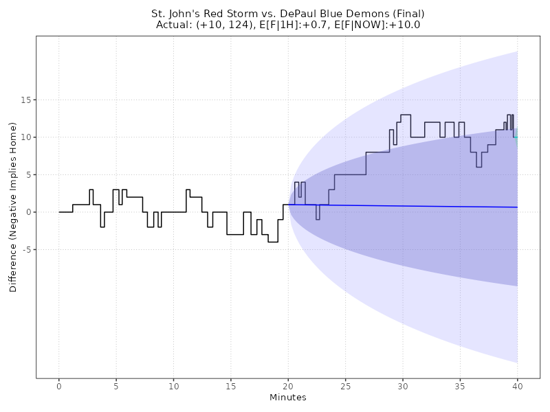 Updated: Tuesday, Feb 03 11:06:03 PM EST St. John's Red Storm vs DePaul Blue Demons (Final) 68 - 56, (Margin: +12, Total: 124) Wintrust Arena Second-Half conditional estimates based on a margin of +1.0 points and 57.0 total points (models are continuously adjusted up to Halftime) ------------------------------------------------------------------------------------------------------------------------------------------------------ E[AWAY] E[HOME] E[SP] 68% CI E[TOTAL] 68% CI 2H-A 2H-H 2H-SP 2H-TTL AWAY WIN% HOME WIN% (ODDS HOME) ====================================================================================================================================================== 62.8 59.0 3.8 (-6.2, +13.9) 121.8 (109.6, 134.0) 0.0 0.0 +3.8 121.8 68.8% 31.2% +220 ------------------------------------------------------------------------------------------------------------------------------------------------------ Live conditional estimates per 5 Minutes (+/- 1 deviation) (models are continuously adjusted) ------------------------------------------------------------------------------------------------------------------------------------------------------ TYPE 5M 10M 15M 20M 25M 30M 35M 40M ====================================================================================================================================================== E[SP] - - - - - - - +9.4 P[W] - - - - - - - 0.0% ODDS - - - - - - - +99999 ------------------------------------------------------------------------------------------------------------------------------------------------------ Ornstein-Uhlenbeck Process with BIC Model Selection** TYPE L95% E[X] U95% E[F|1H] -20.2 0.7 21.5 E[F|NOW] 6.9 10.0 13.1 Enhanced Ornstein-Uhlenbeck Process (BIC-optimized AR order, continuous-time Kalman filtering)MODEL NOTES: ** O-U Process validated on 61,166 games (MAE: 8.50 pts, well-calibrated 68%/95% confidence intervals) ** GRU v6.0 validated on Fall 2025 (MAE: 10.99 pts, 5.2% better than previous LSTM) CHART LEGEND: 1) Blue line: O-U Improved model trained on first-half data, locked at halftime (68% and 95% CI shown) 2) Green line: O-U Improved model continuously retrained as new plays arrive (68% CI shown) 3) Both lines use the same statistical model; divergence shows how live events update predictions 4) Model automatically selects AR(1) or AR(2) using BIC for optimal fit to irregular scoring events Updated: Tuesday, Feb 03 11:06:03 PM EST Back