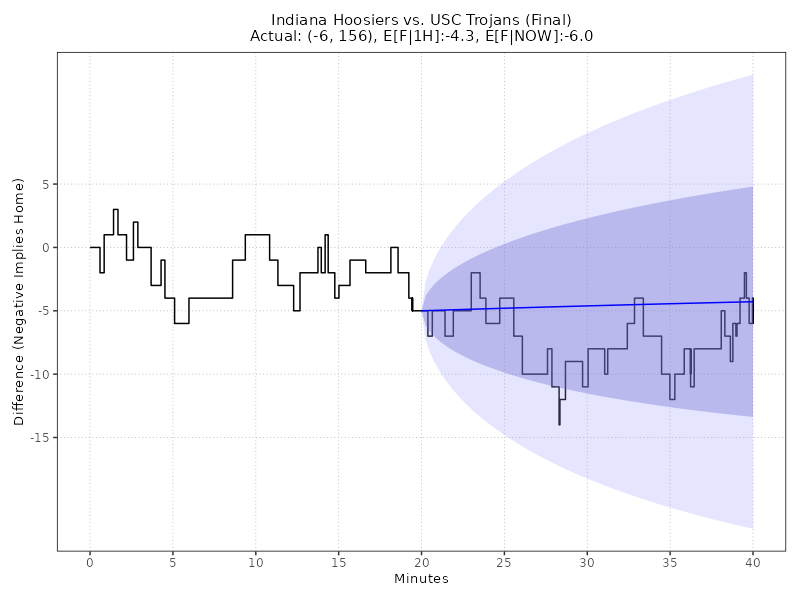 Updated: Tuesday, Feb 03 11:03:46 PM EST Indiana Hoosiers vs USC Trojans (Halftime) 30 - 35, (Margin: -5, Total: 65) Galen Center Second-Half conditional estimates based on a margin of -5.0 points and 65.0 total points (models are continuously adjusted up to Halftime) ------------------------------------------------------------------------------------------------------------------------------------------------------ E[AWAY] E[HOME] E[SP] 68% CI E[TOTAL] 68% CI 2H-A 2H-H 2H-SP 2H-TTL AWAY WIN% HOME WIN% (ODDS HOME) ====================================================================================================================================================== 67.6 70.7 -3.1 (-13.2, +6.9) 138.2 (126.0, 150.4) 0.0 0.0 -3.1 138.2 42.7% 57.3% -134 ------------------------------------------------------------------------------------------------------------------------------------------------------ Live conditional estimates per 5 Minutes (+/- 1 deviation) (models are continuously adjusted) ------------------------------------------------------------------------------------------------------------------------------------------------------ TYPE 5M 10M 15M 20M 25M 30M 35M 40M ====================================================================================================================================================== E[SP] - - - -8.4 -7.3 -6.4 -5.5 -5.5 P[W] - - - 57.3% 60.9% 66.3% 76.6% 100.0% ODDS - - - -134 -156 -197 -328 -99999 ------------------------------------------------------------------------------------------------------------------------------------------------------ Ornstein-Uhlenbeck Process with BIC Model Selection** TYPE L95% E[X] U95% E[F|1H] -22.3 -4.2 13.9 E[F|NOW] -22.3 -4.2 13.9 Enhanced Ornstein-Uhlenbeck Process (BIC-optimized AR order, continuous-time Kalman filtering)MODEL NOTES: ** O-U Process validated on 61,166 games (MAE: 8.50 pts, well-calibrated 68%/95% confidence intervals) ** GRU v6.0 validated on Fall 2025 (MAE: 10.99 pts, 5.2% better than previous LSTM) CHART LEGEND: 1) Blue line: O-U Improved model trained on first-half data, locked at halftime (68% and 95% CI shown) 2) Green line: O-U Improved model continuously retrained as new plays arrive (68% CI shown) 3) Both lines use the same statistical model; divergence shows how live events update predictions 4) Model automatically selects AR(1) or AR(2) using BIC for optimal fit to irregular scoring events Updated: Tuesday, Feb 03 11:03:46 PM EST Back