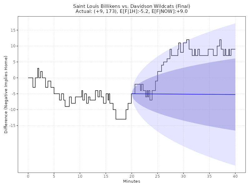 Updated: Tuesday, Feb 03 11:03:49 PM EST Saint Louis Billikens vs Davidson Wildcats (3:31 - 2nd) 82 - 73, (Margin: +9, Total: 155) John M. Belk Arena Second-Half conditional estimates based on a margin of -5.0 points and 87.0 total points (models are continuously adjusted up to Halftime) ------------------------------------------------------------------------------------------------------------------------------------------------------ E[AWAY] E[HOME] E[SP] 68% CI E[TOTAL] 68% CI 2H-A 2H-H 2H-SP 2H-TTL AWAY WIN% HOME WIN% (ODDS HOME) ====================================================================================================================================================== 90.1 93.2 -3.1 (-13.2, +6.9) 183.3 (171.2, 195.5) 0.0 0.0 -3.1 183.3 42.7% 57.3% -134 ------------------------------------------------------------------------------------------------------------------------------------------------------ Live conditional estimates per 5 Minutes (+/- 1 deviation) (models are continuously adjusted) ------------------------------------------------------------------------------------------------------------------------------------------------------ TYPE 5M 10M 15M 20M 25M 30M 35M 40M ====================================================================================================================================================== E[SP] - - - - - - - +8.4 P[W] - - - - - - - 0.0% ODDS - - - - - - - +99999 ------------------------------------------------------------------------------------------------------------------------------------------------------ Ornstein-Uhlenbeck Process with BIC Model Selection** TYPE L95% E[X] U95% E[F|1H] -27.6 -5.2 17.1 E[F|NOW] -2.1 8.6 19.4 Enhanced Ornstein-Uhlenbeck Process (BIC-optimized AR order, continuous-time Kalman filtering)MODEL NOTES: ** O-U Process validated on 61,166 games (MAE: 8.50 pts, well-calibrated 68%/95% confidence intervals) ** GRU v6.0 validated on Fall 2025 (MAE: 10.99 pts, 5.2% better than previous LSTM) CHART LEGEND: 1) Blue line: O-U Improved model trained on first-half data, locked at halftime (68% and 95% CI shown) 2) Green line: O-U Improved model continuously retrained as new plays arrive (68% CI shown) 3) Both lines use the same statistical model; divergence shows how live events update predictions 4) Model automatically selects AR(1) or AR(2) using BIC for optimal fit to irregular scoring events Updated: Tuesday, Feb 03 11:03:49 PM EST Back