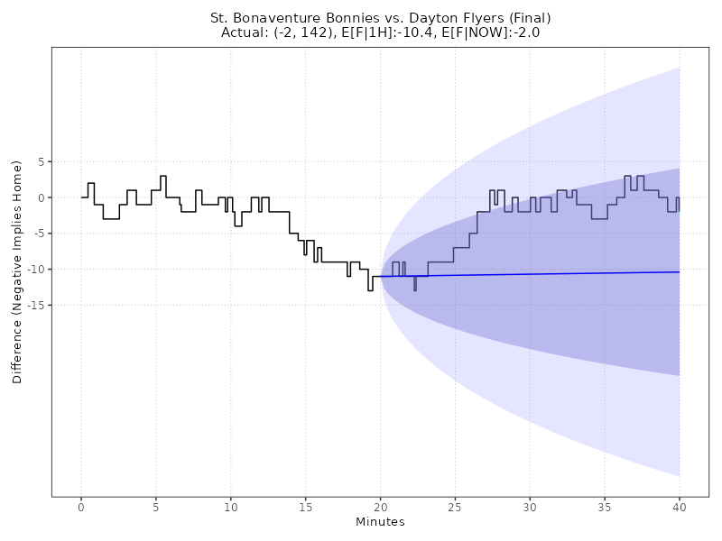 Updated: Tuesday, Feb 03 11:06:00 PM EST St. Bonaventure Bonnies vs Dayton Flyers (Final) 70 - 72, (Margin: -2, Total: 142) UD Arena Second-Half conditional estimates based on a margin of -11.0 points and 71.0 total points (models are continuously adjusted up to Halftime) ------------------------------------------------------------------------------------------------------------------------------------------------------ E[AWAY] E[HOME] E[SP] 68% CI E[TOTAL] 68% CI 2H-A 2H-H 2H-SP 2H-TTL AWAY WIN% HOME WIN% (ODDS HOME) ====================================================================================================================================================== 70.2 80.3 -10.1 (-20.1, -0.0) 150.5 (138.3, 162.7) 0.0 0.0 -10.1 150.5 20.1% 79.9% -398 ------------------------------------------------------------------------------------------------------------------------------------------------------ Live conditional estimates per 5 Minutes (+/- 1 deviation) (models are continuously adjusted) ------------------------------------------------------------------------------------------------------------------------------------------------------ TYPE 5M 10M 15M 20M 25M 30M 35M 40M ====================================================================================================================================================== E[SP] - - - - - - - -2.6 P[W] - - - - - - - 98.4% ODDS - - - - - - - -6335 ------------------------------------------------------------------------------------------------------------------------------------------------------ Ornstein-Uhlenbeck Process with BIC Model Selection** TYPE L95% E[X] U95% E[F|1H] -38.9 -10.4 18.1 E[F|NOW] -3.3 -2.0 -0.7 Enhanced Ornstein-Uhlenbeck Process (BIC-optimized AR order, continuous-time Kalman filtering)MODEL NOTES: ** O-U Process validated on 61,166 games (MAE: 8.50 pts, well-calibrated 68%/95% confidence intervals) ** GRU v6.0 validated on Fall 2025 (MAE: 10.99 pts, 5.2% better than previous LSTM) CHART LEGEND: 1) Blue line: O-U Improved model trained on first-half data, locked at halftime (68% and 95% CI shown) 2) Green line: O-U Improved model continuously retrained as new plays arrive (68% CI shown) 3) Both lines use the same statistical model; divergence shows how live events update predictions 4) Model automatically selects AR(1) or AR(2) using BIC for optimal fit to irregular scoring events Updated: Tuesday, Feb 03 11:06:00 PM EST Back