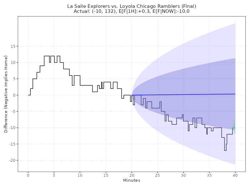 Updated: Tuesday, Feb 03 11:06:04 PM EST La Salle Explorers vs Loyola Chicago Ramblers (Final) 61 - 71, (Margin: -10, Total: 132) Gentile Arena Second-Half conditional estimates based on a margin of +0.0 points and 60.0 total points (models are continuously adjusted up to Halftime) ------------------------------------------------------------------------------------------------------------------------------------------------------ E[AWAY] E[HOME] E[SP] 68% CI E[TOTAL] 68% CI 2H-A 2H-H 2H-SP 2H-TTL AWAY WIN% HOME WIN% (ODDS HOME) ====================================================================================================================================================== 65.3 62.7 2.7 (-7.4, +12.7) 128.0 (115.8, 140.2) 0.0 0.0 +2.7 128.0 64.8% 35.2% +184 ------------------------------------------------------------------------------------------------------------------------------------------------------ Live conditional estimates per 5 Minutes (+/- 1 deviation) (models are continuously adjusted) ------------------------------------------------------------------------------------------------------------------------------------------------------ TYPE 5M 10M 15M 20M 25M 30M 35M 40M ====================================================================================================================================================== E[SP] - - - - - - - -10.5 P[W] - - - - - - - 100.0% ODDS - - - - - - - -99999 ------------------------------------------------------------------------------------------------------------------------------------------------------ Ornstein-Uhlenbeck Process with BIC Model Selection** TYPE L95% E[X] U95% E[F|1H] -21.4 0.3 22.0 E[F|NOW] -14.1 -10.0 -5.9 Enhanced Ornstein-Uhlenbeck Process (BIC-optimized AR order, continuous-time Kalman filtering)MODEL NOTES: ** O-U Process validated on 61,166 games (MAE: 8.50 pts, well-calibrated 68%/95% confidence intervals) ** GRU v6.0 validated on Fall 2025 (MAE: 10.99 pts, 5.2% better than previous LSTM) CHART LEGEND: 1) Blue line: O-U Improved model trained on first-half data, locked at halftime (68% and 95% CI shown) 2) Green line: O-U Improved model continuously retrained as new plays arrive (68% CI shown) 3) Both lines use the same statistical model; divergence shows how live events update predictions 4) Model automatically selects AR(1) or AR(2) using BIC for optimal fit to irregular scoring events Updated: Tuesday, Feb 03 11:06:04 PM EST Back