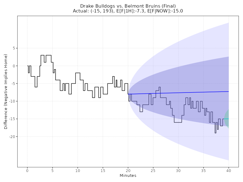 Updated: Tuesday, Feb 03 11:03:56 PM EST Drake Bulldogs vs Belmont Bruins (1:11 - 2nd) 85 - 100, (Margin: -15, Total: 185) Curb Event Center Arena Second-Half conditional estimates based on a margin of -8.0 points and 94.0 total points (models are continuously adjusted up to Halftime) ------------------------------------------------------------------------------------------------------------------------------------------------------ E[AWAY] E[HOME] E[SP] 68% CI E[TOTAL] 68% CI 2H-A 2H-H 2H-SP 2H-TTL AWAY WIN% HOME WIN% (ODDS HOME) ====================================================================================================================================================== 95.6 102.1 -6.6 (-16.6, +3.5) 197.7 (185.5, 209.9) 0.0 0.0 -6.6 197.7 30.2% 69.8% -231 ------------------------------------------------------------------------------------------------------------------------------------------------------ Live conditional estimates per 5 Minutes (+/- 1 deviation) (models are continuously adjusted) ------------------------------------------------------------------------------------------------------------------------------------------------------ TYPE 5M 10M 15M 20M 25M 30M 35M 40M ====================================================================================================================================================== E[SP] - - - - - - - -15.5 P[W] - - - - - - - 100.0% ODDS - - - - - - - - ------------------------------------------------------------------------------------------------------------------------------------------------------ Ornstein-Uhlenbeck Process with BIC Model Selection** TYPE L95% E[X] U95% E[F|1H] -26.7 -7.3 12.2 E[F|NOW] -20.4 -15.0 -9.5 Enhanced Ornstein-Uhlenbeck Process (BIC-optimized AR order, continuous-time Kalman filtering)MODEL NOTES: ** O-U Process validated on 61,166 games (MAE: 8.50 pts, well-calibrated 68%/95% confidence intervals) ** GRU v6.0 validated on Fall 2025 (MAE: 10.99 pts, 5.2% better than previous LSTM) CHART LEGEND: 1) Blue line: O-U Improved model trained on first-half data, locked at halftime (68% and 95% CI shown) 2) Green line: O-U Improved model continuously retrained as new plays arrive (68% CI shown) 3) Both lines use the same statistical model; divergence shows how live events update predictions 4) Model automatically selects AR(1) or AR(2) using BIC for optimal fit to irregular scoring events Updated: Tuesday, Feb 03 11:03:56 PM EST Back