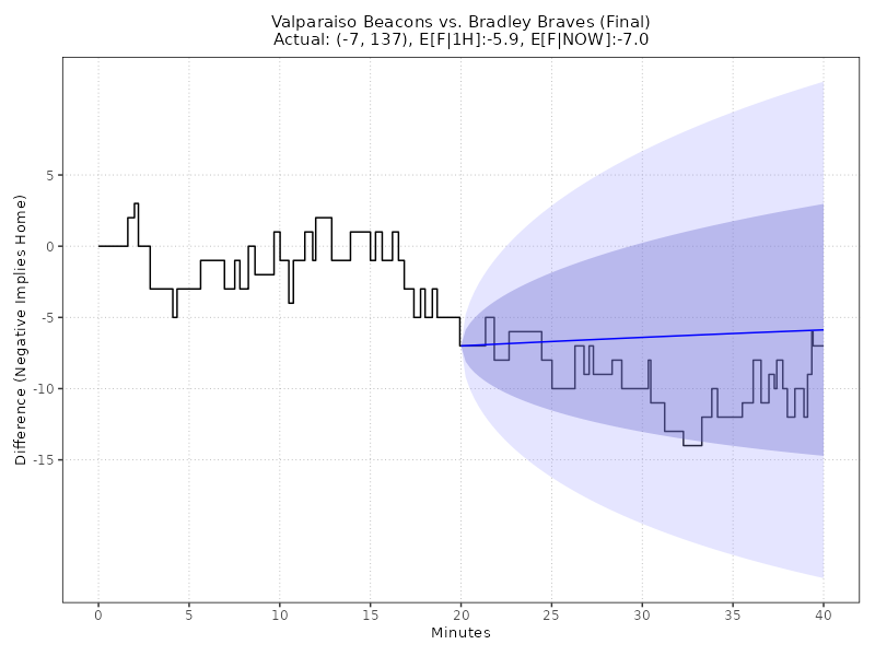 Updated: Tuesday, Feb 03 11:04:03 PM EST Valparaiso Beacons vs Bradley Braves (Final) 65 - 72, (Margin: -7, Total: 137) Carver Arena Second-Half conditional estimates based on a margin of -7.0 points and 73.0 total points (models are continuously adjusted up to Halftime) ------------------------------------------------------------------------------------------------------------------------------------------------------ E[AWAY] E[HOME] E[SP] 68% CI E[TOTAL] 68% CI 2H-A 2H-H 2H-SP 2H-TTL AWAY WIN% HOME WIN% (ODDS HOME) ====================================================================================================================================================== 74.6 80.0 -5.4 (-15.5, +4.6) 154.6 (142.4, 166.8) 0.0 0.0 -5.4 154.6 34.1% 65.9% -193 ------------------------------------------------------------------------------------------------------------------------------------------------------ Live conditional estimates per 5 Minutes (+/- 1 deviation) (models are continuously adjusted) ------------------------------------------------------------------------------------------------------------------------------------------------------ TYPE 5M 10M 15M 20M 25M 30M 35M 40M ====================================================================================================================================================== E[SP] - - - - - - - -7.5 P[W] - - - - - - - 100.0% ODDS - - - - - - - -99999 ------------------------------------------------------------------------------------------------------------------------------------------------------ Ornstein-Uhlenbeck Process with BIC Model Selection** TYPE L95% E[X] U95% E[F|1H] -23.3 -5.9 11.6 E[F|NOW] -7.0 -7.0 -7.0 Enhanced Ornstein-Uhlenbeck Process (BIC-optimized AR order, continuous-time Kalman filtering)MODEL NOTES: ** O-U Process validated on 61,166 games (MAE: 8.50 pts, well-calibrated 68%/95% confidence intervals) ** GRU v6.0 validated on Fall 2025 (MAE: 10.99 pts, 5.2% better than previous LSTM) CHART LEGEND: 1) Blue line: O-U Improved model trained on first-half data, locked at halftime (68% and 95% CI shown) 2) Green line: O-U Improved model continuously retrained as new plays arrive (68% CI shown) 3) Both lines use the same statistical model; divergence shows how live events update predictions 4) Model automatically selects AR(1) or AR(2) using BIC for optimal fit to irregular scoring events Updated: Tuesday, Feb 03 11:04:03 PM EST Back