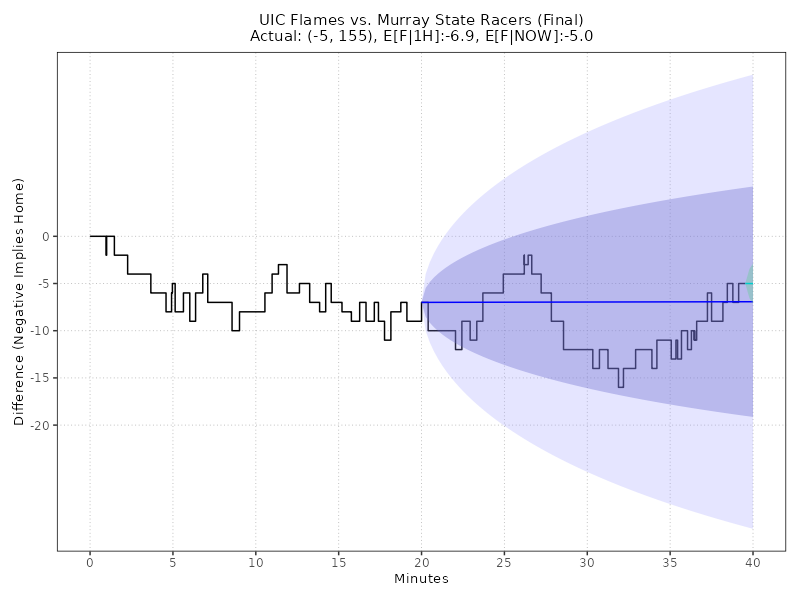 Updated: Tuesday, Feb 03 11:03:56 PM EST UIC Flames vs Murray State Racers (Final) 74 - 81, (Margin: -7, Total: 155) CFSB Center Second-Half conditional estimates based on a margin of -7.0 points and 73.0 total points (models are continuously adjusted up to Halftime) ------------------------------------------------------------------------------------------------------------------------------------------------------ E[AWAY] E[HOME] E[SP] 68% CI E[TOTAL] 68% CI 2H-A 2H-H 2H-SP 2H-TTL AWAY WIN% HOME WIN% (ODDS HOME) ====================================================================================================================================================== 74.6 80.0 -5.4 (-15.5, +4.6) 154.6 (142.4, 166.8) 0.0 0.0 -5.4 154.6 34.1% 65.9% -193 ------------------------------------------------------------------------------------------------------------------------------------------------------ Live conditional estimates per 5 Minutes (+/- 1 deviation) (models are continuously adjusted) ------------------------------------------------------------------------------------------------------------------------------------------------------ TYPE 5M 10M 15M 20M 25M 30M 35M 40M ====================================================================================================================================================== E[SP] - - - - - - - -5.5 P[W] - - - - - - - 100.0% ODDS - - - - - - - -99999 ------------------------------------------------------------------------------------------------------------------------------------------------------ Ornstein-Uhlenbeck Process with BIC Model Selection** TYPE L95% E[X] U95% E[F|1H] -31.0 -6.9 17.1 E[F|NOW] -9.2 -5.0 -0.8 Enhanced Ornstein-Uhlenbeck Process (BIC-optimized AR order, continuous-time Kalman filtering)MODEL NOTES: ** O-U Process validated on 61,166 games (MAE: 8.50 pts, well-calibrated 68%/95% confidence intervals) ** GRU v6.0 validated on Fall 2025 (MAE: 10.99 pts, 5.2% better than previous LSTM) CHART LEGEND: 1) Blue line: O-U Improved model trained on first-half data, locked at halftime (68% and 95% CI shown) 2) Green line: O-U Improved model continuously retrained as new plays arrive (68% CI shown) 3) Both lines use the same statistical model; divergence shows how live events update predictions 4) Model automatically selects AR(1) or AR(2) using BIC for optimal fit to irregular scoring events Updated: Tuesday, Feb 03 11:03:56 PM EST Back
